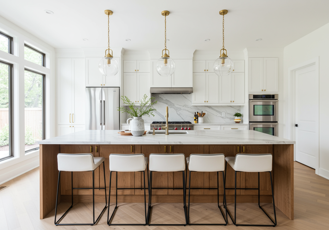 Create a cozy and inviting space for the living room with plenty of seating. Arrange the furniture to make the room feel open and spacious. Add some throw pillows and blankets in a variety of textures to make it look even more inviting. The goal when staging is to give the room a designated purpose — create a cozy space for movie nights in the living room and a clean and functional feel in the kitchen.
